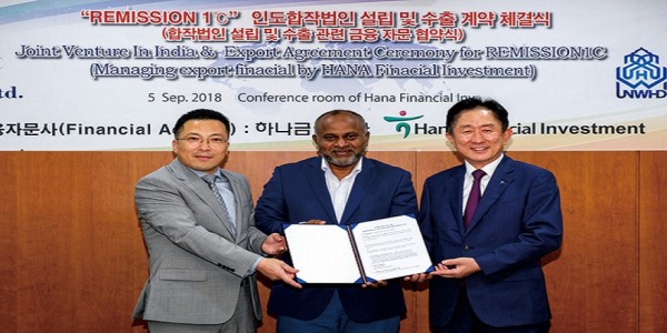 인도 합작 법인 체결식에서 한성호 대표(왼쪽)가 하나금융투자 이진국 사장, 세계할랄연맹 모하메드 진나 회장과 함께 했다